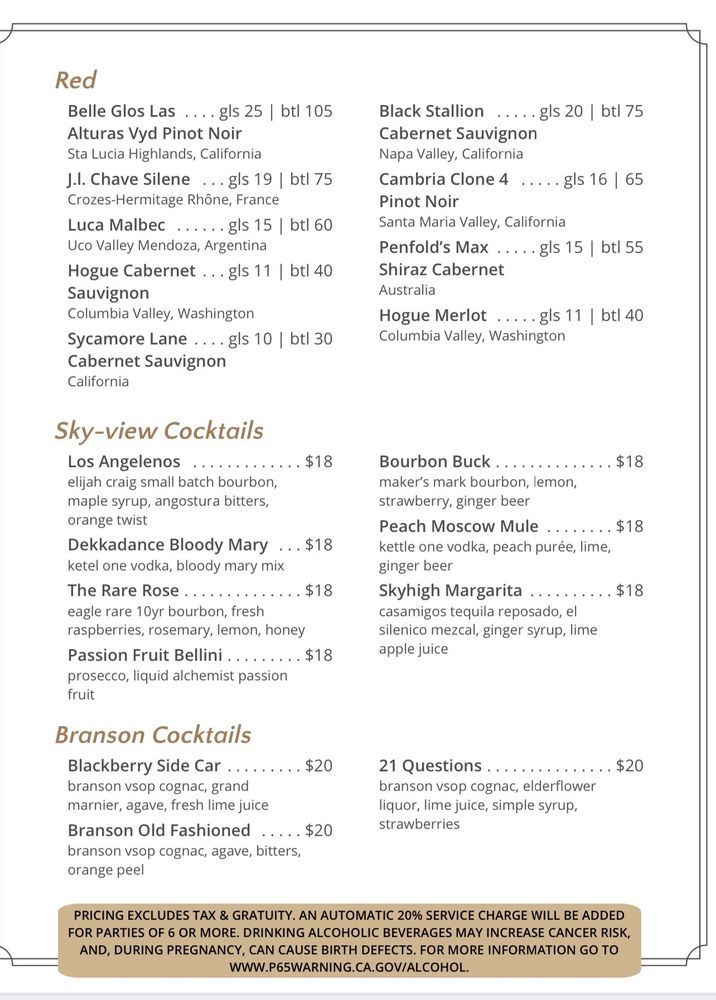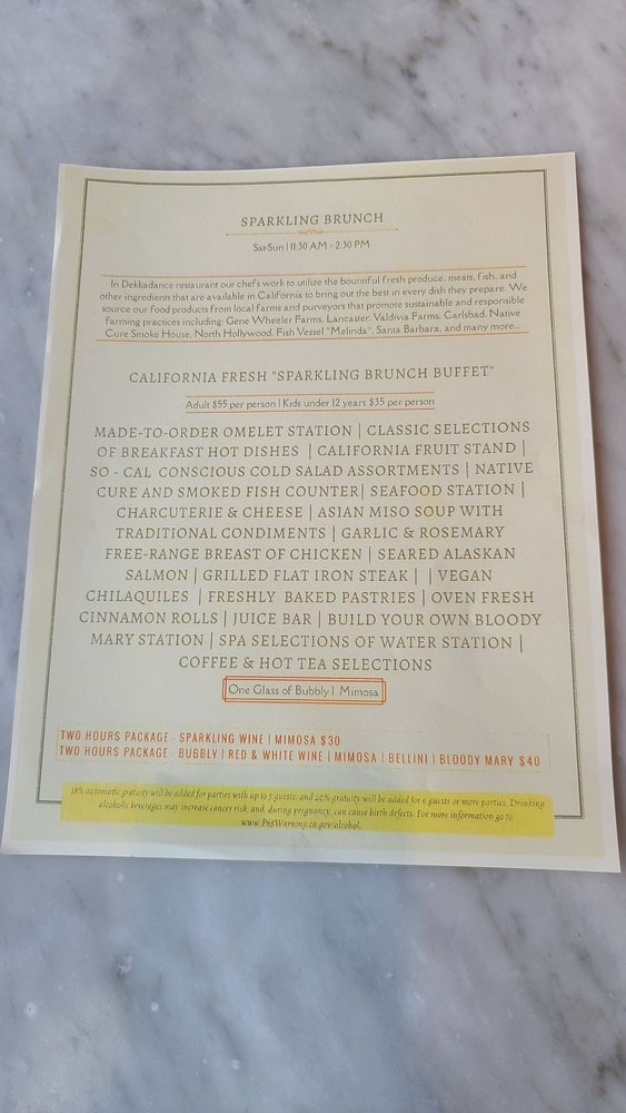 Dekkadance, situated at 900 Wilshire Blvd Fl 69 in Los Angeles, offers a diverse menu for breakfast, brunch, lunch, and dinner. This upscale restaurant provides a variety of options, including vegan and vegetarian dishes, making it a great choice for a wide range of diners. The California Fresh "Breakfast Buffet" features a delightful spread of morning favorites, while local favorites like the "DekkBrek" and California Conscious dishes cater to different tastes. Customers praise the food quality, with fresh ingredients and tasty offerings. The views from the 69th floor enhance the dining experience, with a 360-degree panorama of the city. Overall, Dekkadance provides a memorable culinary experience in a trendy yet classy setting.
