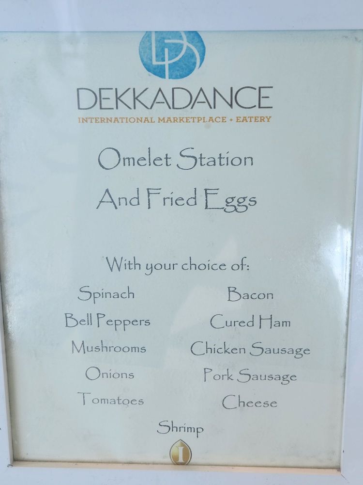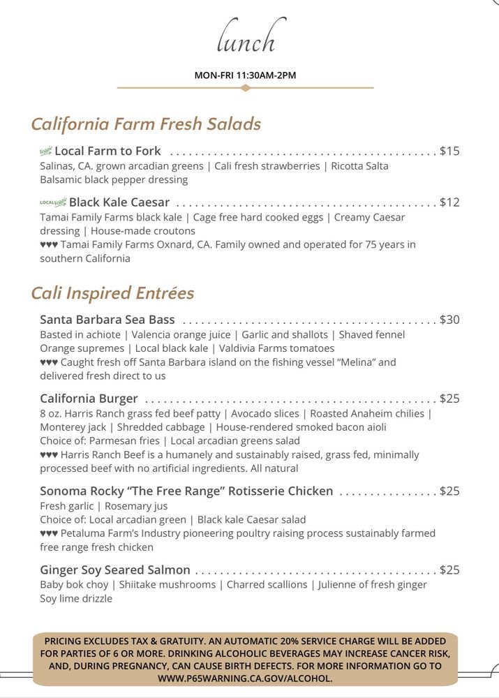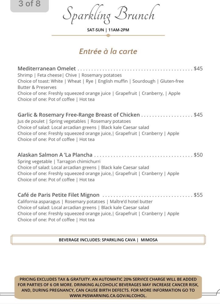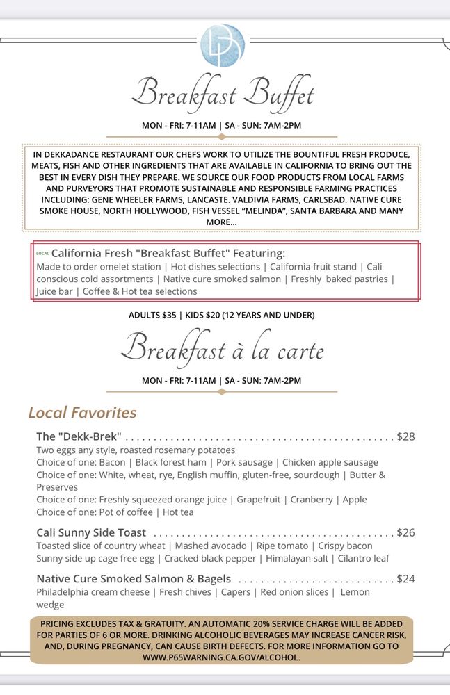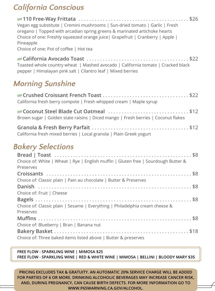 Made-to-order omelet station | Classic selections of breakfast hot dishes | California fruit stand | Cali conscious cold salad assortments | Native cure smoked & pastrami salmon | Charcuterie & cheese | Asian miso soup with traditional condiments | Freshly baked pastries | Oven fresh cinnamon rolls | Juice bar | Build your own Bloody Mary station | Spa selections of water station | Coffee & hot tea selections